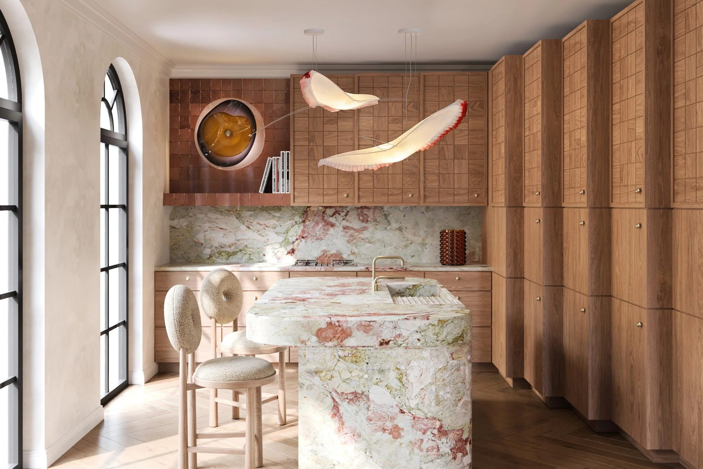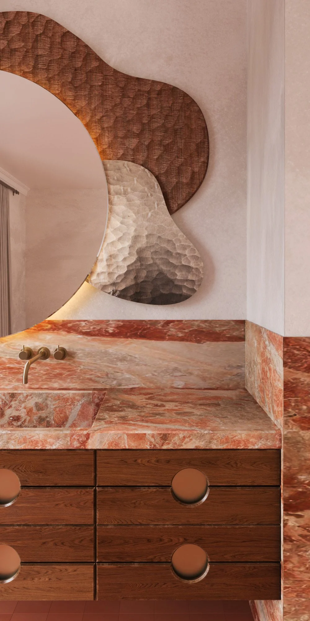 Materiality follows the same logic. Warm wood, veined stone and textured ceramics create depth and continuity, allowing surfaces to actively influence perception and atmosphere.