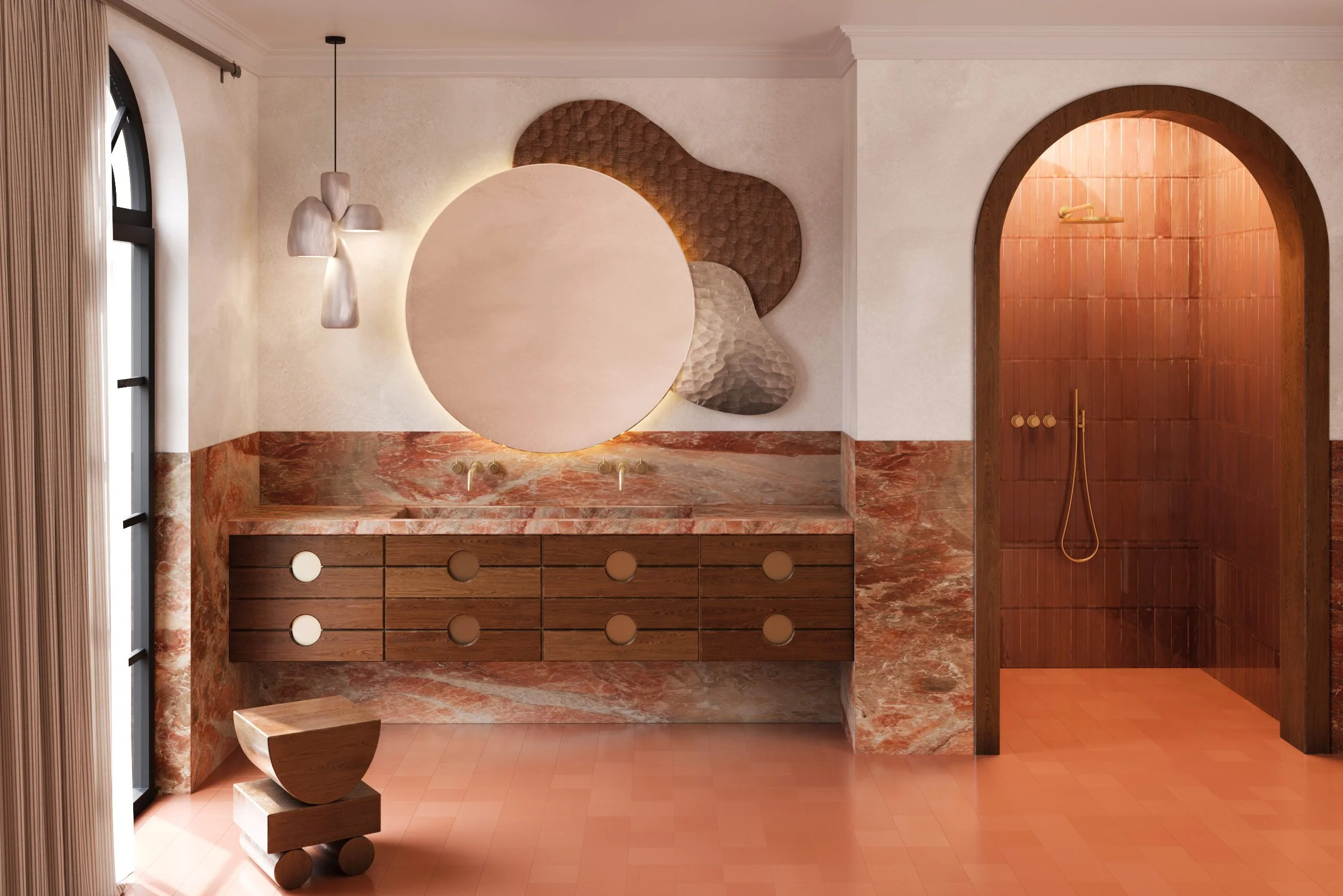 The apartment is conceived as a sequence rather than a fixed composition. Soft transitions and curved geometries define a continuous flow, where each room holds its own identity while remaining part of a coherent spatial narrative.