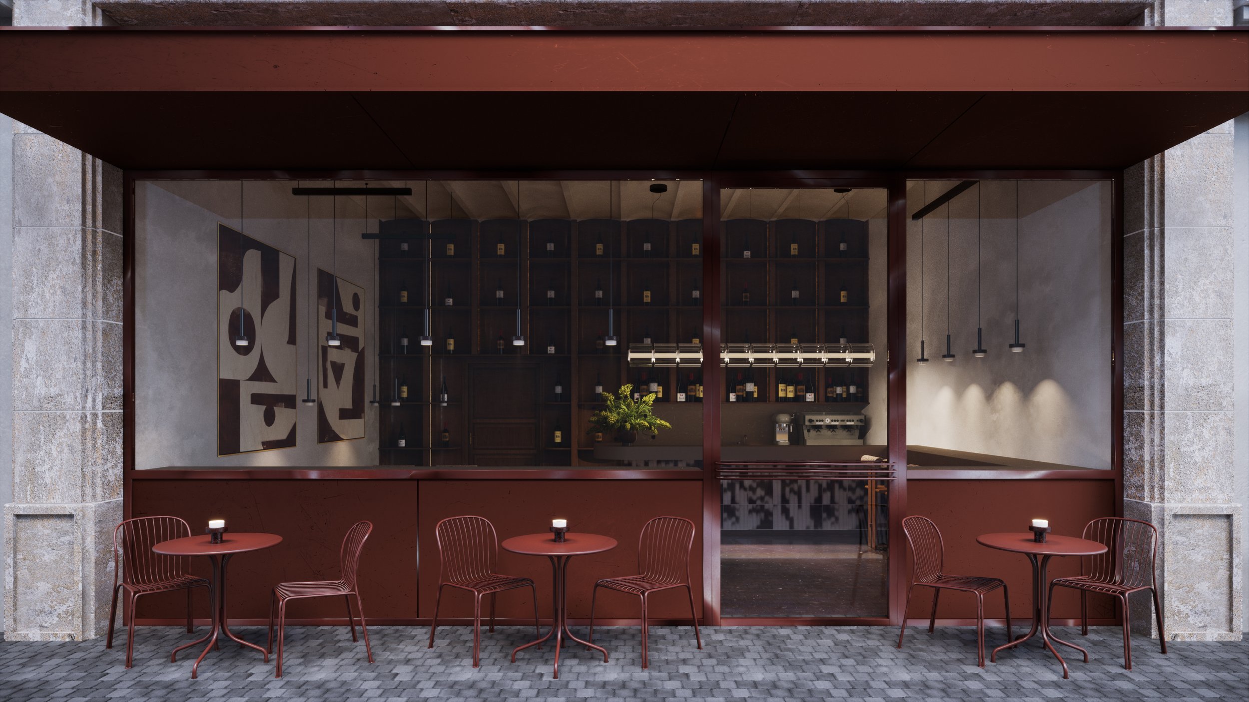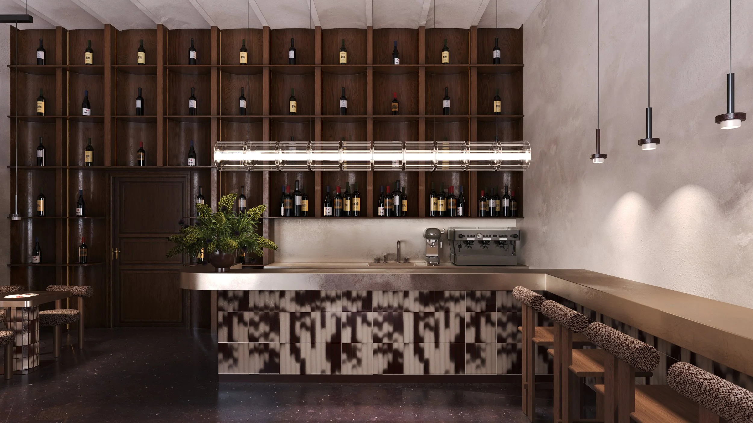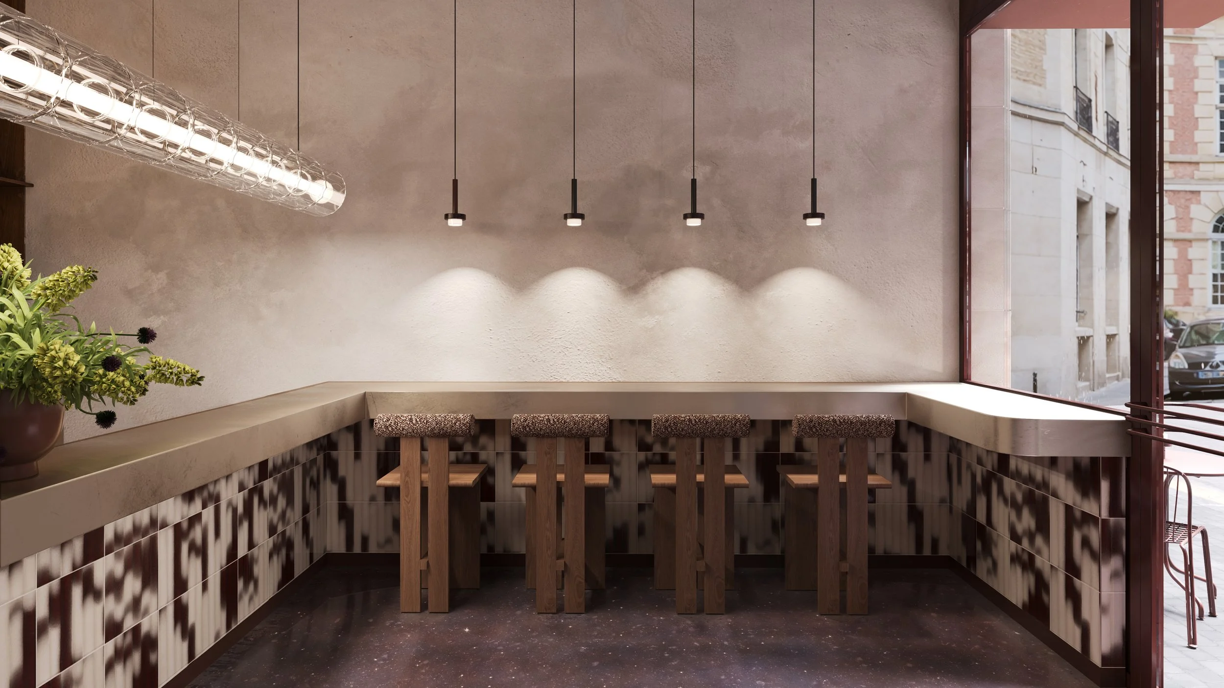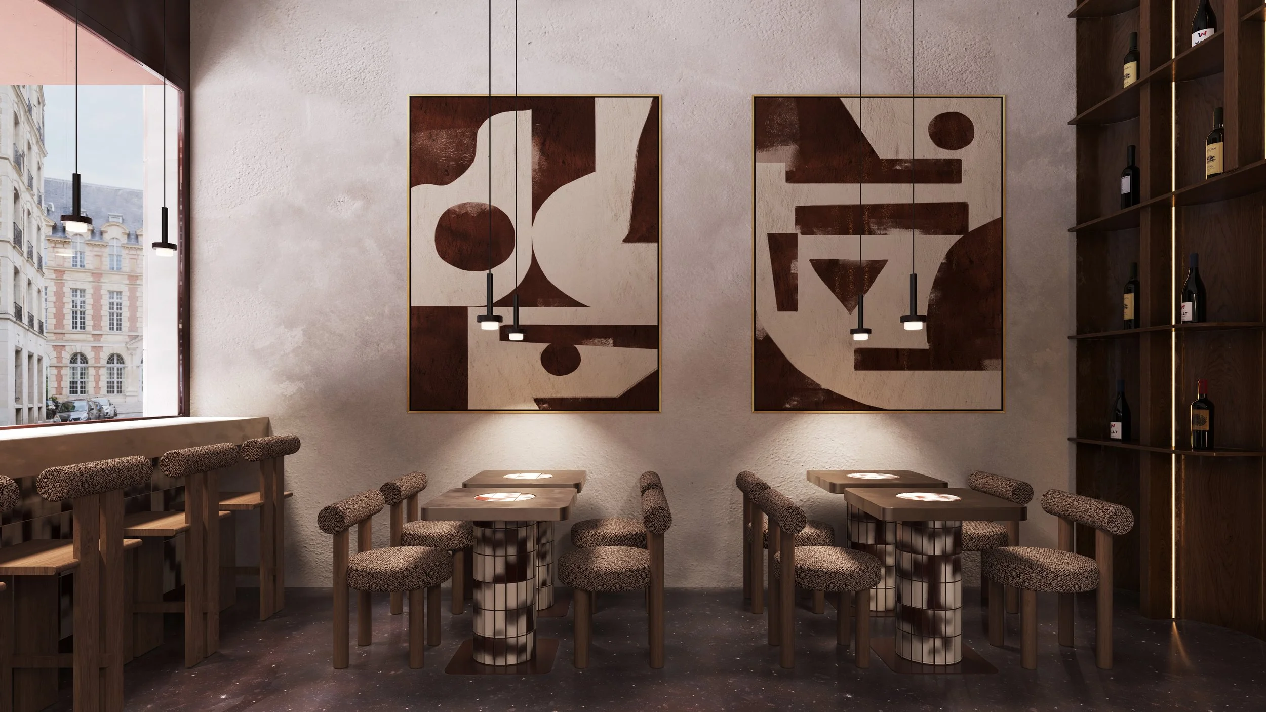 A café conceived as a spatial composition, where every element is reduced, positioned, and intentional.