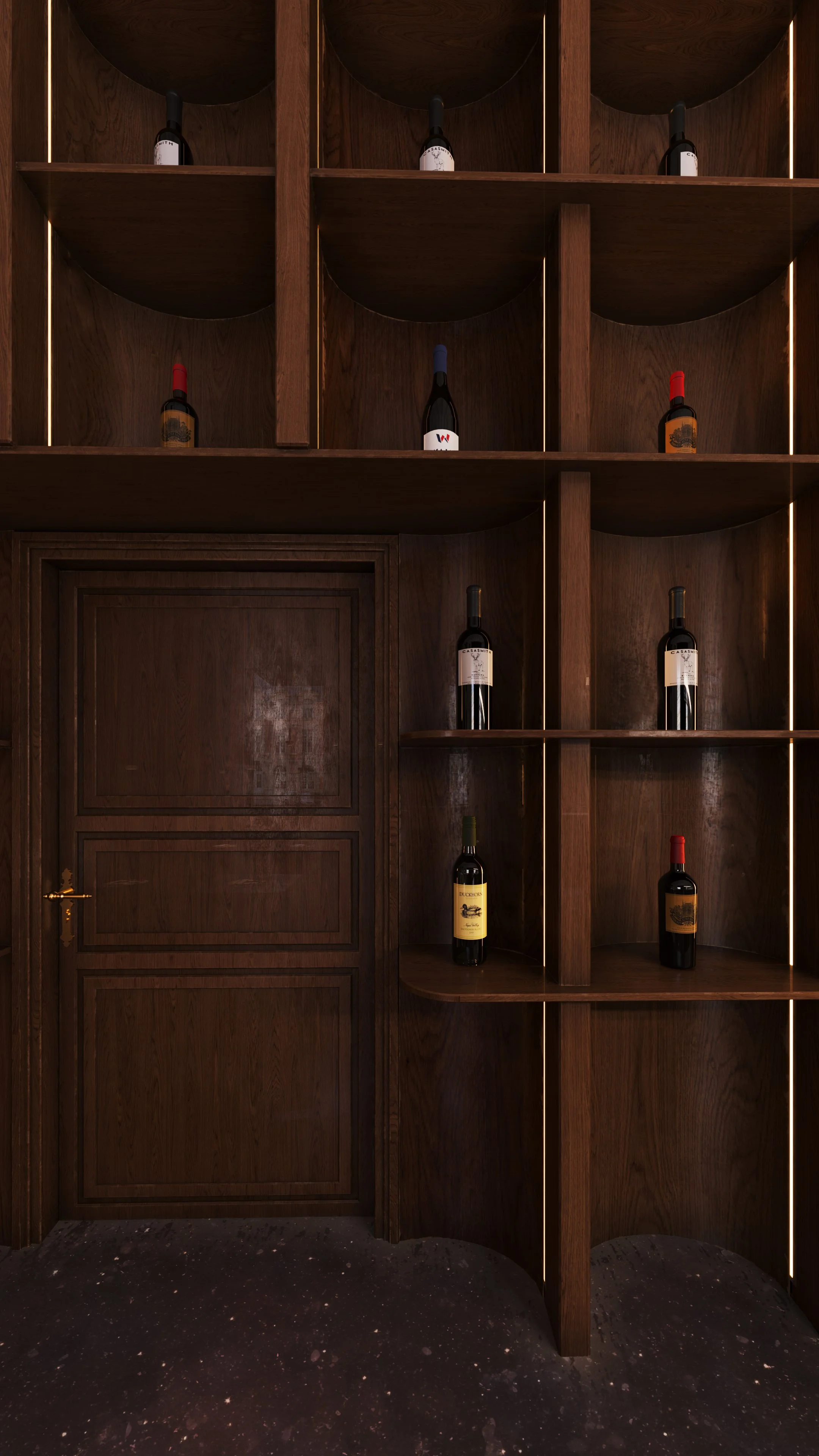 The interior is reduced to essential elements. A central wall integrates the wine display, conceived as both a functional system and a spatial anchor. It structures the room while acting as a visible focal point, reinforcing the overall composition.